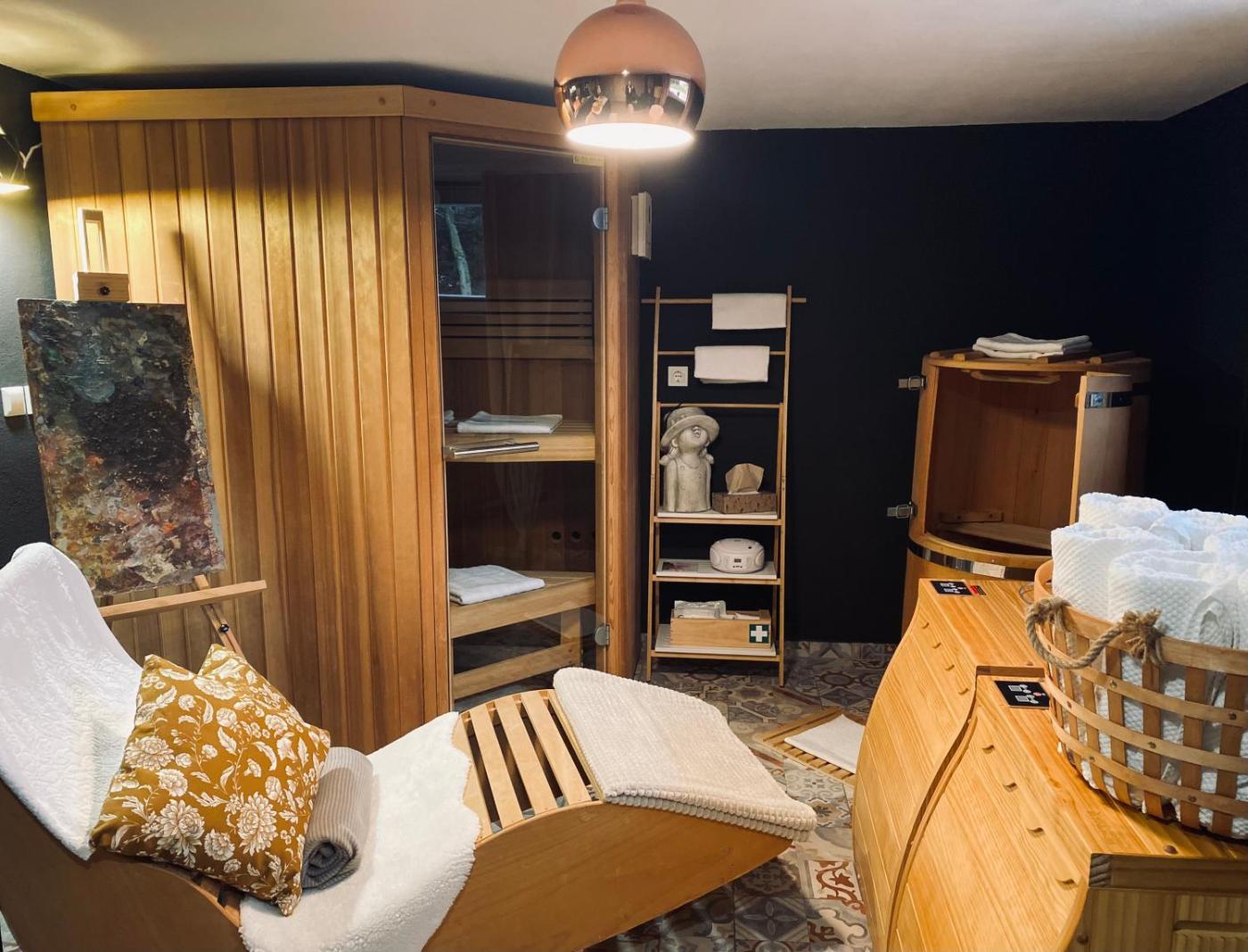 Family Room. The sauna is the standout feature of this family room. Featuring free toiletries, this family room includes a private bathroom with a shower, a hairdryer and slippers. The fully equipped kitchen features a stovetop, a refrigerator, kitchenware and a microwave. This family room has a washing machine, flat-screen TV, garden views, as well as winechampagne for guests. The unit has 3 beds. ;